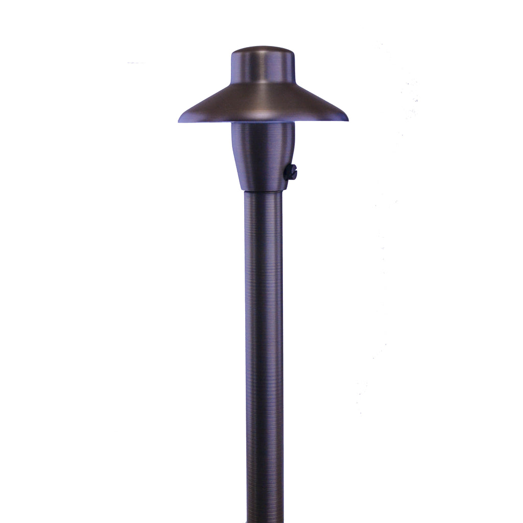 China Hat - 4.5" Shade - These LED landscape path lights are cast in brass, with a smooth, brushed bronze finish. These lights blend perfectly with virtually all old world, natural, transitional and contemporary landscape themes to display your outdoor landscape pathways and chosen areas. . This area light comes with a matching 1” x 15 ½” stem, plus an 8½” ground stake. You will find it to very effectively complement and enhance the beauty of your garden areas, walkways and outdoor architecture.