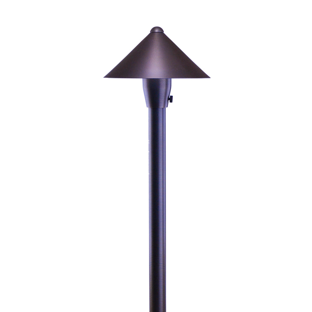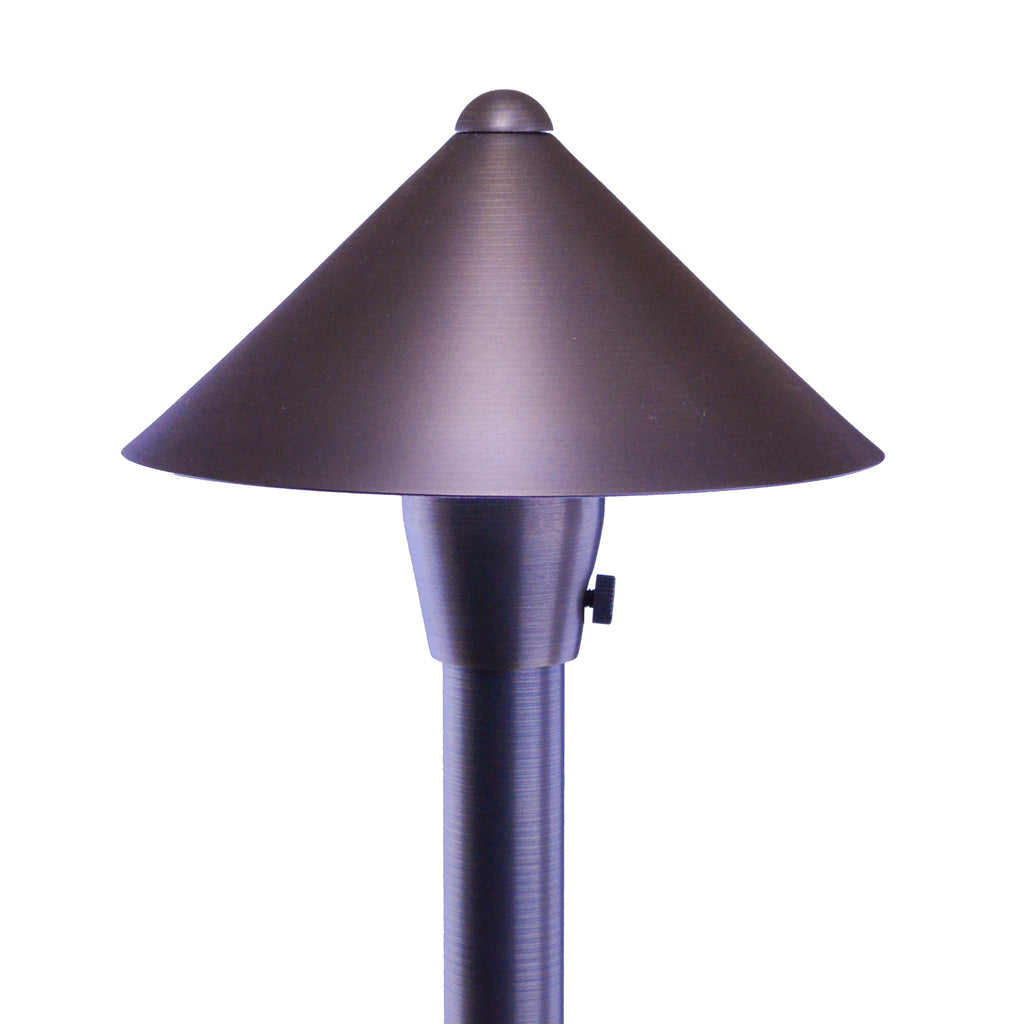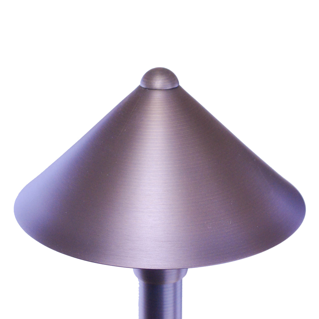 Cone Head - 6" Shade - These heavy-duty outdoor led path lights sport a “cone head” style canopy, is cast in brass, with a smooth brushed antique bronze finish. It’s clean sharp design will complement contemporary and transitional landscape designs and architectural motifs to attractively illuminate and show off your outdoor landscape walkways and garden features. It is hardy and solid in material and construction, with total design to give you a lifetime of classic elegance and performance. The fixture comes with a matching 1” x 18” stem and an 8 ½” ground stake.